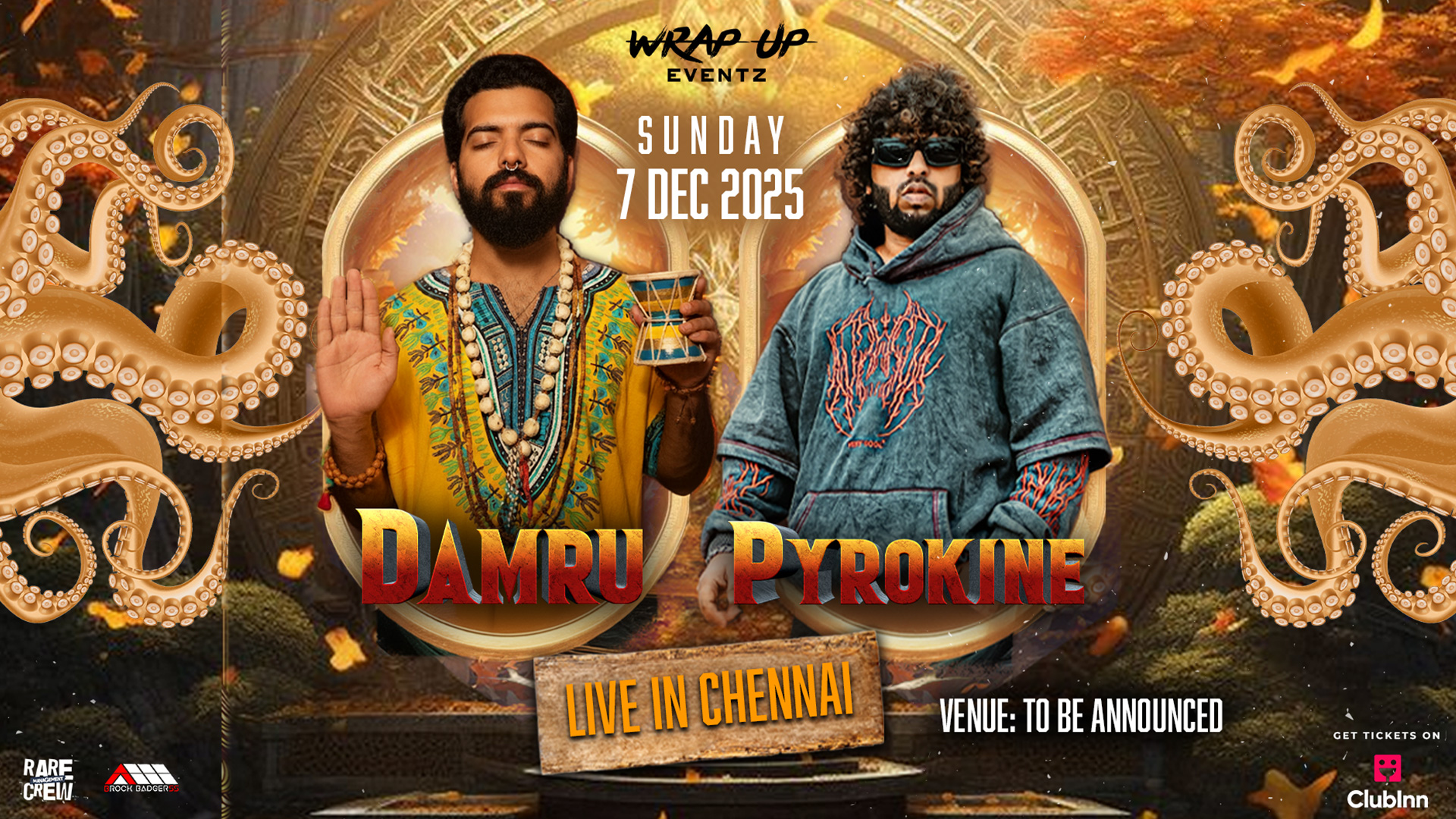 DAMRU - LIVE IN CHENNAIDate: 7th Dec / Sun / 8pm onwardsFeaturing: DAMRUAlong with: PYROKINEEntry: SINGLE ENTRY - 999/- ( Only Entry )* Additionally cover charges apply on gatesFor More Details: 8866222751