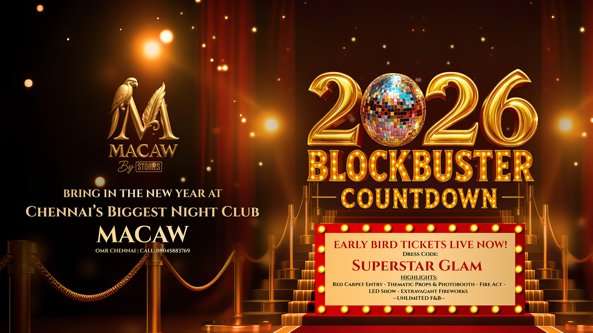 BLOCKBUSTER COUNTDOWN 2026( New Year’s Eve Party )Date: 31st Dec / Wed / 8pm onwardsVenue: MACAW BY STORIES - OMRDress Code: SUPERSTAR GLAMHighlights:* RED CARPET ENTRY* THEMATIC PROPS & PHOTO BOOTH* FIRE ACT* LED SHOW* EXTRAVAGANT FIRE WORKS* UNLIMITED FOOD & BEVERAGESThe countdown to