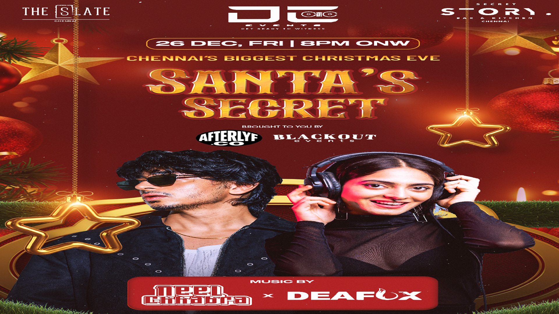 CHENNAI'S BIGGEST CHRISTMAS EVESANTA'S SECRETDate: 26th Dec / Fri / 8pm onwardsVenue: SECRET STORYFeaturing: NEEL CHHABRA x DEAFOX( A SPECIAL B2B SET )Along with: DJ MANAVDress Code: RED & WHITE ATTIRENote: Additionally cover charges apply on gates as mandatoryFor More Details: 8866222751