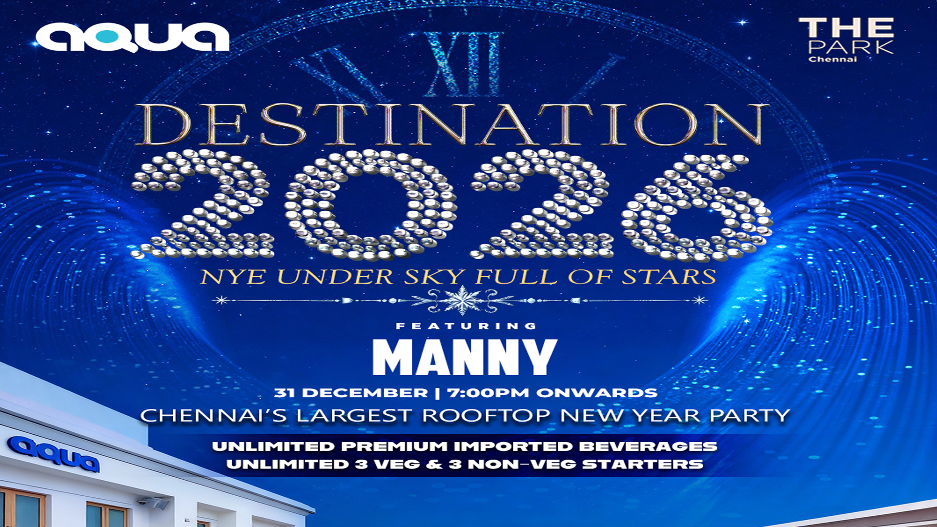 DESTINATION 2026NYE UNDER SKY FULL OF STARS( CHENNAI'S LARGEST ROOFTOP NEW YEAR PARTY )Date: 31st Dec / Wed / 7pm onwardsVenue: AQUA - THE PARKFeaturing: DJ MANNYUnlimited Premium Imported BeveragesUnlimited 3 Veg & 3 Non-Veg StartersFor More Details: 8866222751