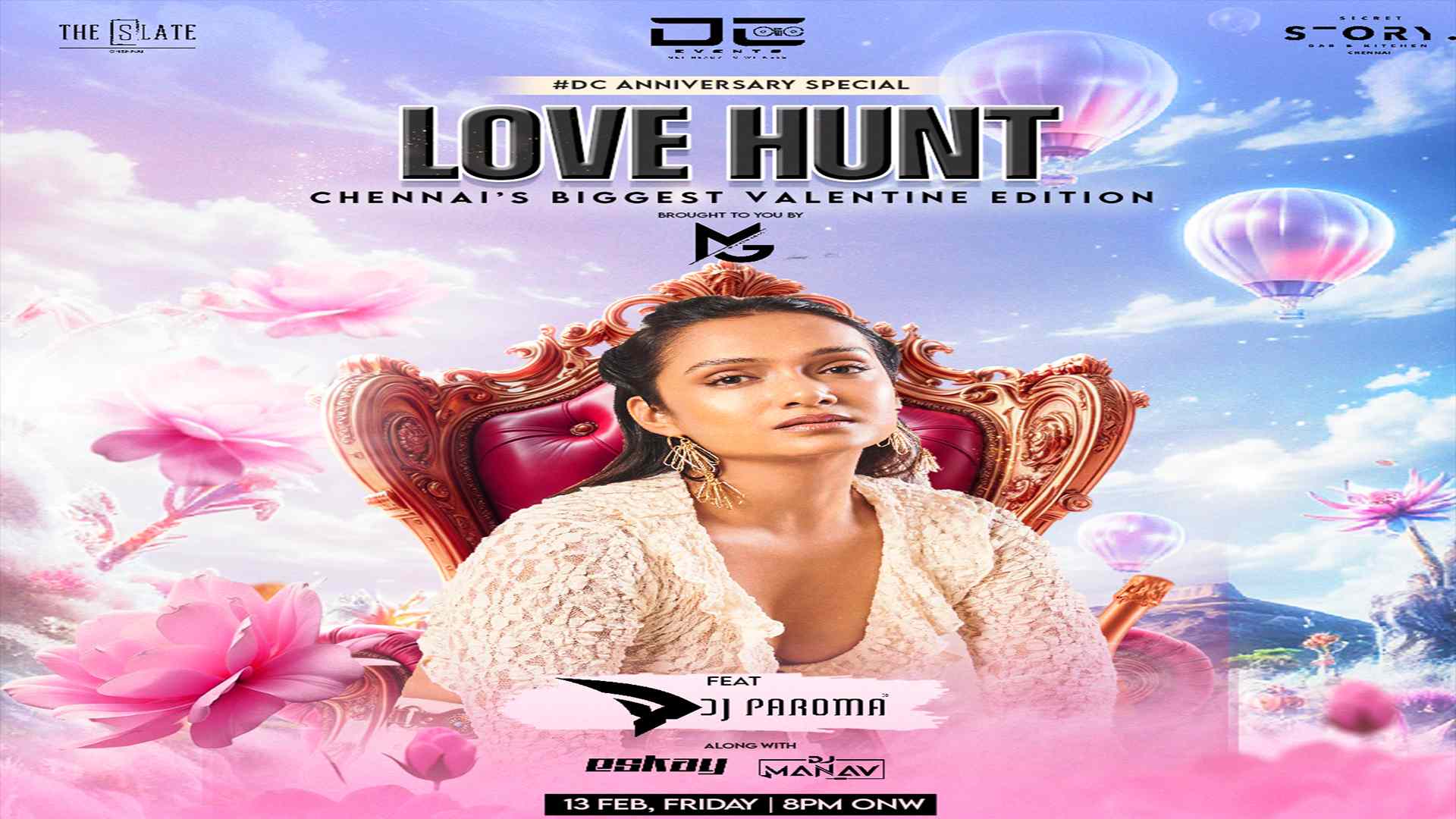LOVE HUNTCHENNAI'S BIGGEST VALENTINE EDITION#DC ANNIVERSARY SPECIALDate: 13th Feb / Fri / 8pm onwardsVenue: SECRET STORYFeaturing: DJ PAROMAAlong with: DJ ESKAY x DJ MANAVGirls - 500/- ( Only Entry )* Additionally 500/- cover charges apply on gates as mandatoryMale - 1000/- ( Only Entry )* Additiona